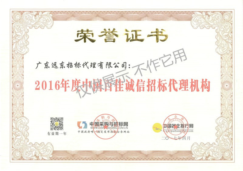 2016年度中國百佳誠信招標(biāo)代理機構(gòu)